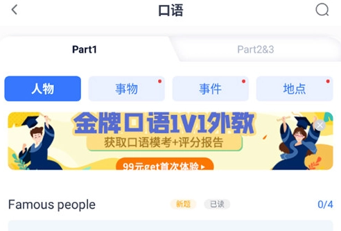 2、点击进入口语练习页面,查看各种练习题及口语模拟;