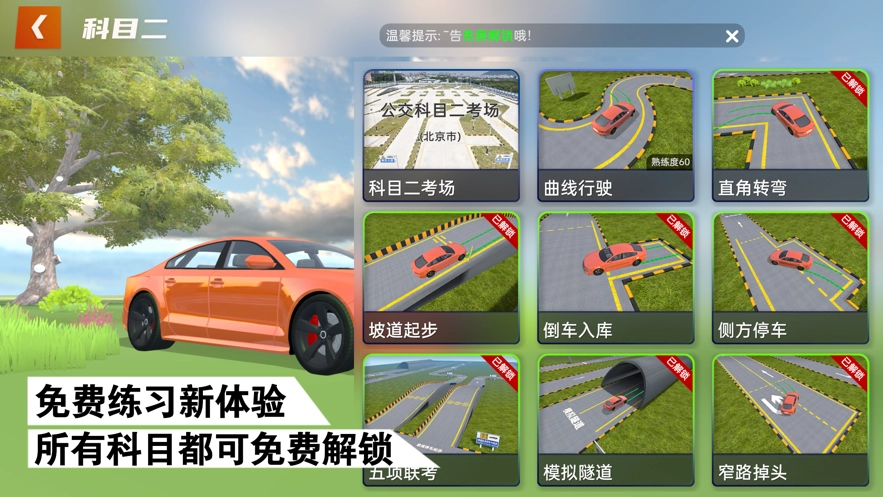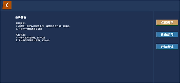2、以科目二为例提供了曲线行驶、直角转弯、坡道起步等全部项目的训练。