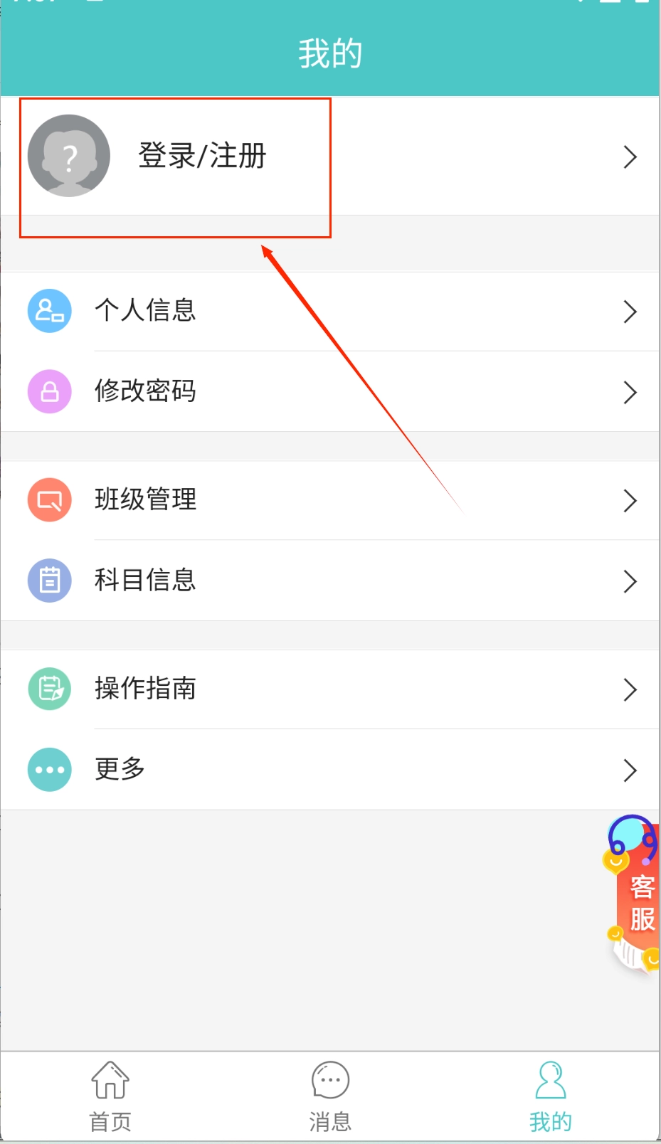 1、打开后点击底部"我的"完成登录注册,完善个人信息后就能使用班级管理和科目设置等教师专属功能啦。