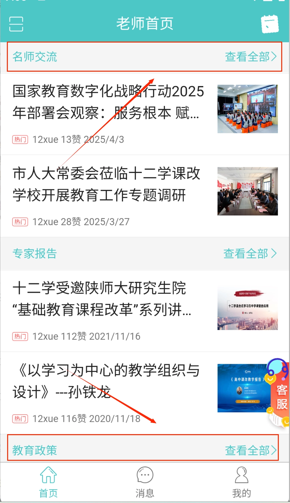 2、在首页查看"名师交流"和"教育政策"板块,获取最新教学资讯,右上角可查看全部文章内容哦。