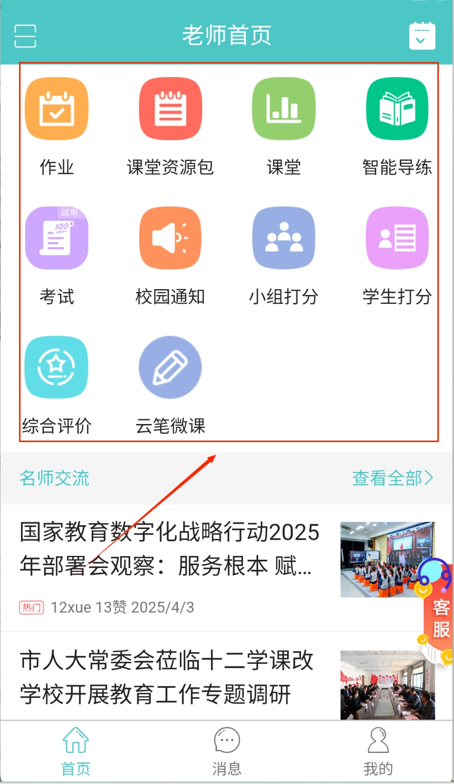3、通过顶部功能图标快速进入课堂、作业等教学模块,智能导练和云笔微课能辅助日常教学工作呢。
