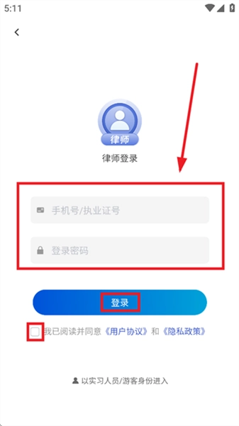进入后,输入手机号/执业证号,登录密码,勾选我已阅读并同意《用户协议》和《隐私政策》,点击登录即可