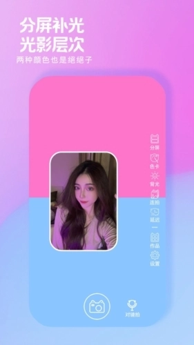 4.全屏分屏自由打光:-应用支持全屏和分屏两种打光模式,通过分屏混合色彩提升拍照的光影层次感,使照片更加生动。
