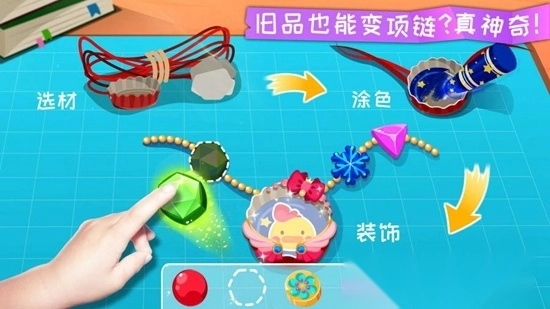 宝宝环保手工游戏安卓版是宝宝巴士推出的一款环保主题儿童益智游戏,宝宝可以在这里变身手工小达人,学习制作创意手工、实现变废为宝,用旧物品自由DIY手链、剪纸、扇子等各种物件,既能锻炼动手能力,又能培养创造力,快来体验吧!
