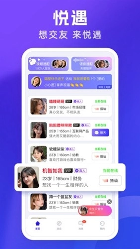 悦遇是一款备受年轻人青睐的同城视频聊天交友应用,在这里你能轻松实现交友、聊天、结识美女、观看精彩视频、进行语音连麦、发起视频聊天、寻找附近好友以及语音互动等多种功能,助力用户迅速开启视频对话,寻觅贴心的陪伴,邂逅更懂你的那个她!【视频交友】众多魅力小姐姐可供选择,一键开启视频交友模式,与高颜值小姐姐在线配对组成CP;【语音交友】海量优质声优实时在线,快速开启语音聊天,收获专属的声音陪伴;【一键语聊】依据个人偏好设置条件,智能匹配更懂你的声优,即刻获得温暖贴心的陪伴;【附近交友】发现身边的人,浏览直播动态,这里有汇聚声音与图文的动态广场,用声音传递内心,遇见懂你的陌声人,找到温暖的灵魂伴侣。期待你在这里,收获更美好的陌声人陪伴!