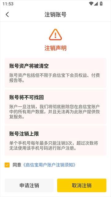 4、勾选“同意《启信宝用户账户注销须知》”,点击“申请注销”按钮