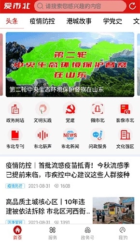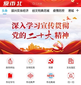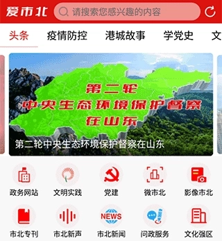 1、爱市北首页界面涵盖了政务网站、文明实践、党建、文化强区、市北专刊、市北新声、市北新闻等功能板块。