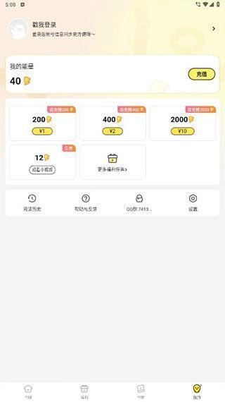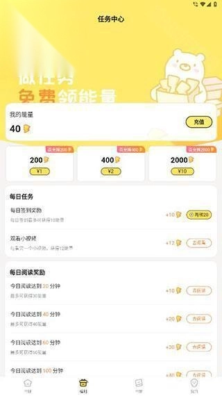 3、福利 点击下方的福利按钮,就能进入福利页面,完成指定任务可获取能量,这些能量可用于解锁小说章节等操作。