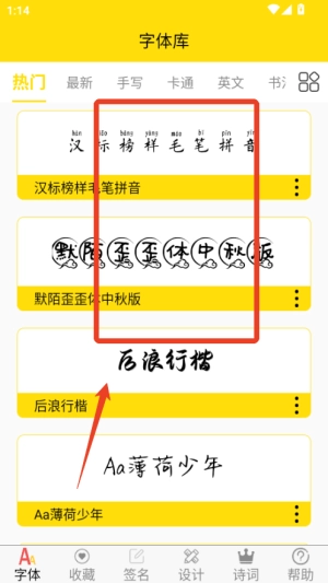 打开应用后,在搜索栏中输入字体名称或风格类型(比如手写体、古典风等),系统便会呈现相关的候选列表,方便您进行浏览与挑选。