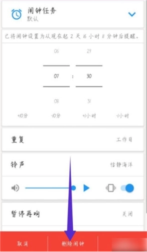 5、进入已打开的闹钟任务页面后,点击页面底部中间位置的删除闹钟按钮即可。具体位置可参照图示。