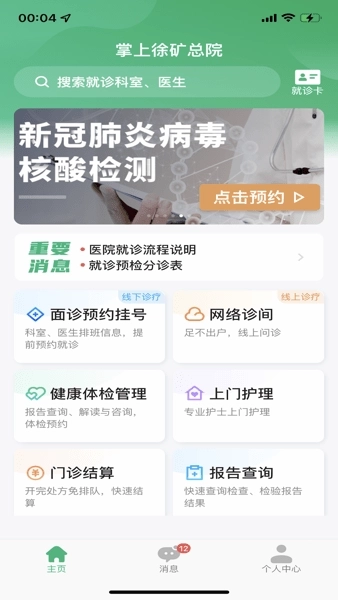 掌上徐矿总院提供了方便快捷的服务,用户可通过该应用轻松预约挂号、查询核酸检测报告、进行网络问诊以及预约核酸检测等功能。软件致力于满足用户寻医问诊、预约挂号、处方开立以及专业信息查询等需求。掌上徐矿总院