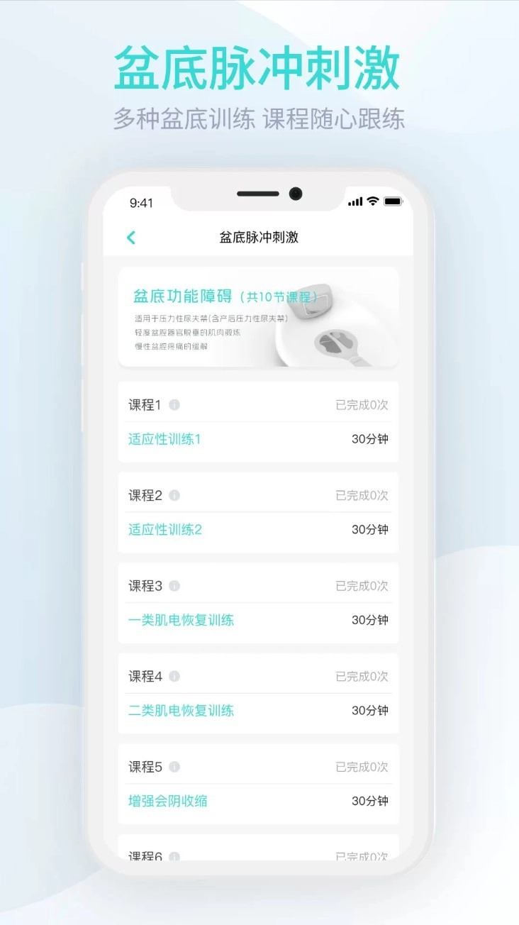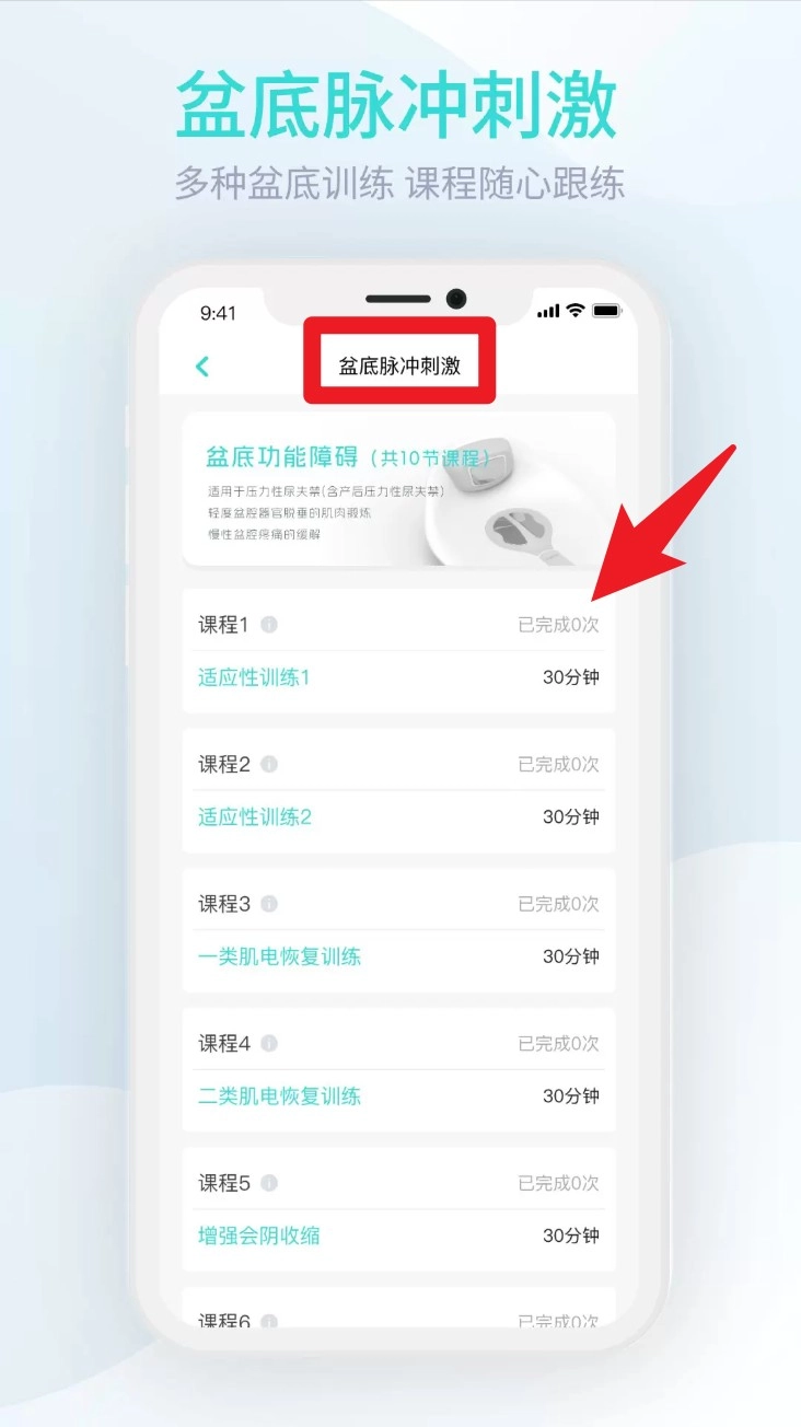 3. 进入盆底脉冲刺激功能后,可根据自身情况挑选合适的训练课程,依照步骤逐一完成练习。