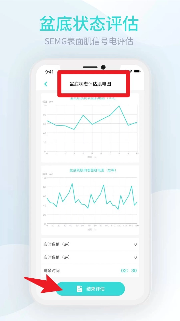 4. 在评估页面能够查看实时肌电波动图,点击下方的结束评估按钮就可以保存此次评估记录。