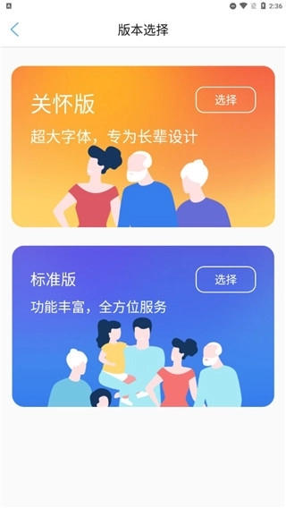 1、大家安装打开后,就可以选择长辈关怀模式或者标准版;