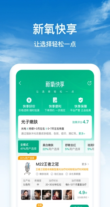 2、消费透明:新氧医美电商平台的项目标价清晰透明,消费者能够借助平台提供的项目对比与机构PK功能,在线进行价格比较,从而拥有透明且安心的消费体验。