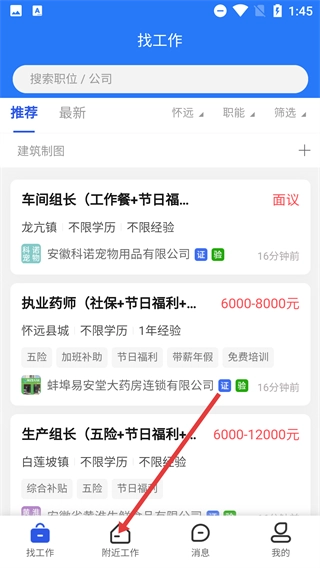 2、在【找工作】页面,可通过顶部【搜索职位/公司】框检索岗位,也能点击底部【附近工作】切换至附近职位列表。