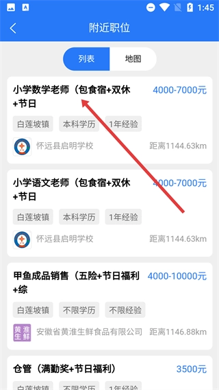 3、进入【附近职位】页面后,查看【列表】形式展示的职位,点击目标职位即可进入该岗位的【工作详情】页面。
