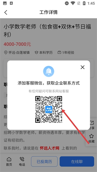 4、在【工作详情】页点击【在线聊】,会弹出含二维码的窗口,扫码添加【客服微信】可获取企业联系方式。
