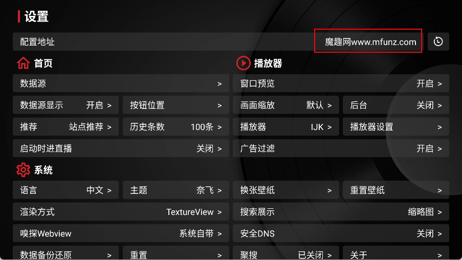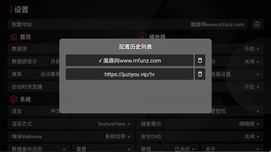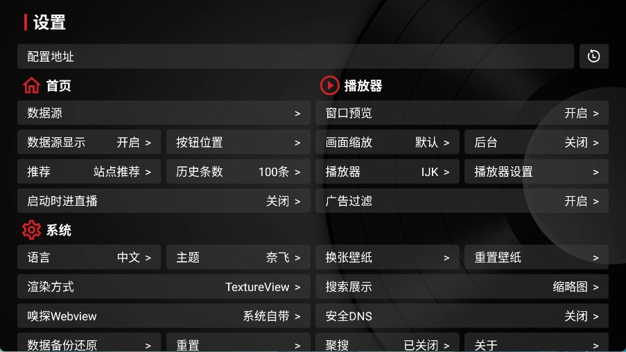点击设置,在配置地址处输入上面的线路地址,电视端输入麻烦可以通过手机扫码填写线路地址(需手机和电视在同一网络环境下,也就是需要连接同一WiFi)