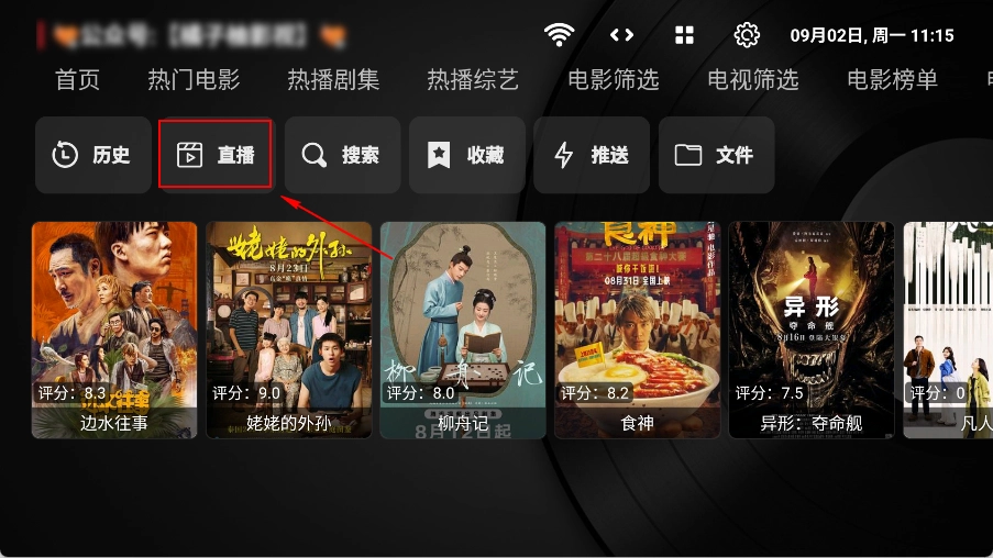 只要配置好源之后,直接在首页点击【直播】即可看电视直播。