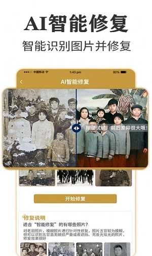 1、能够对残破模糊的黑白老照片进行修复与上色,精准还原照片原本的样貌;