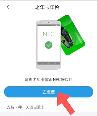 10、点击左上角返回至“老年卡年检”界面,将老年卡再次靠近手机背部的NFC区域,提示“年检成功”,老年卡年检完成。