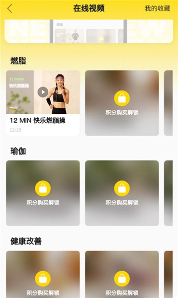 2、然后选择自己要观看课程的类型,这些课程是需要积分才能解锁的,积分可以通过每日签到、发布动态、点赞动态、团课签到、门店打卡等方式获得。