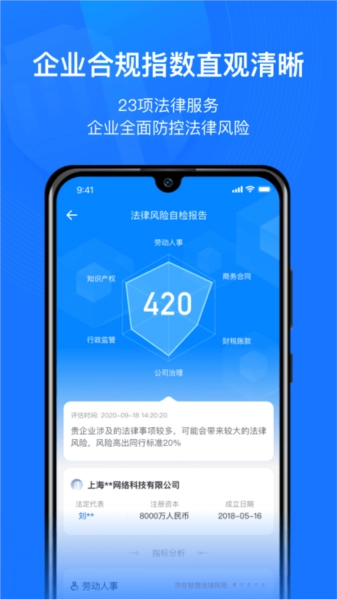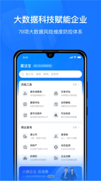 1、大数据科技赋能:79项风险维度防控,利用大数据洞察潜在法律隐患,帮助企业准确自我检查,预防法律纠纷。