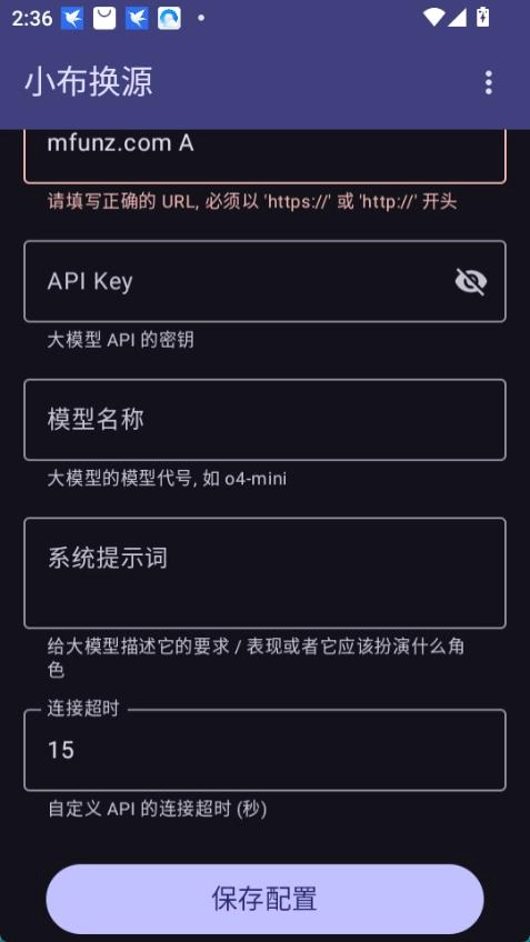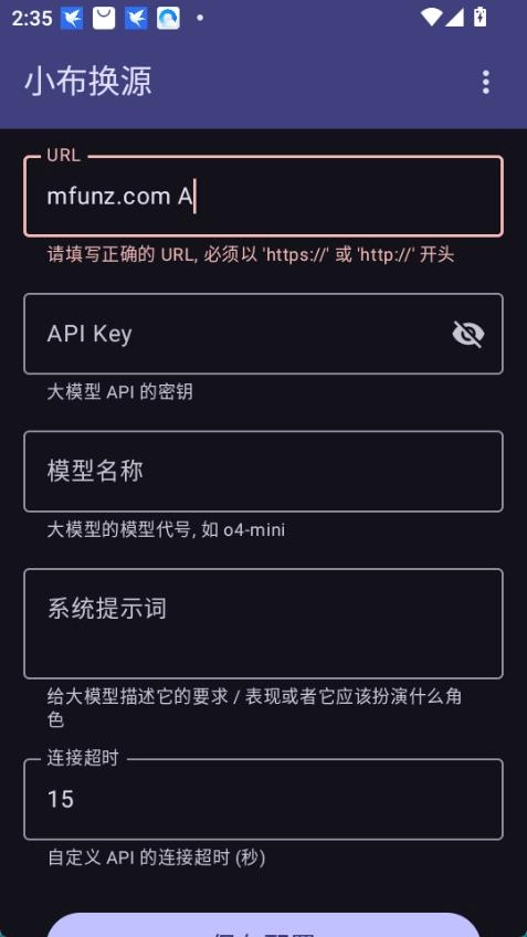 5. 开启小布换源功能,输入第三方API地址与密钥并保存配置。点击右上角的三点图标,进入其他设置界面。
