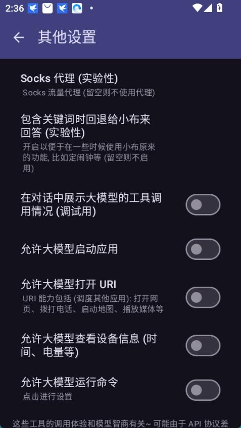 小布换源是一款支持用户自由更换数据源的系统应用,操作步骤很简单:只需填写大模型的API地址,再输入API密钥、模型名称和系统提示词,最后保存配置就能完成换源。除此之外,用户还可以自由开关对话框中大模型工具调用情况的展示功能,也能设置是否允许大模型启动应用,以及是否授权大模型查看设备信息等,这些权限都可根据需求灵活调节。