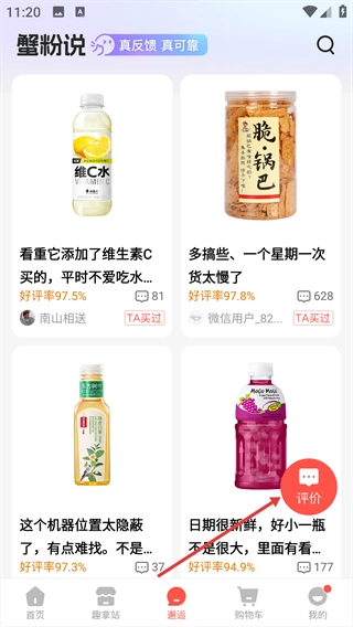 1、在邂逅页面找到并点击【评价】按钮,即可进入评价商品列表页面。