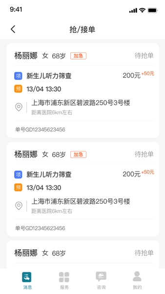 熙心健康护士版是专为护士接单打造的工具,护士们可以通过它查看自己当前进行中和已完成的订单,平台还配备了完善的工单记录功能,个人的保单任务、服务项目、收入等各项信息都清晰明了,方便随时查看。