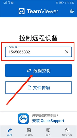2、然后在手机上的“连接”页面中输入电脑中的id,选择“远程控制”按钮就可以进行连接了;