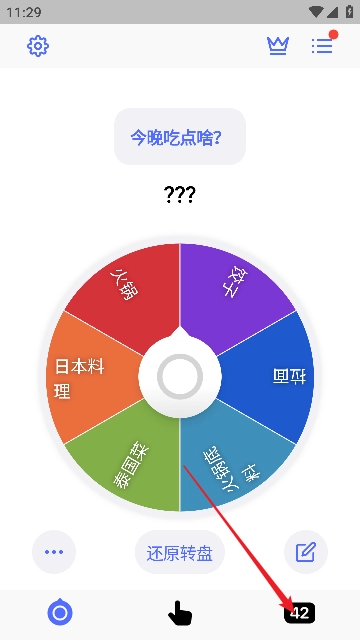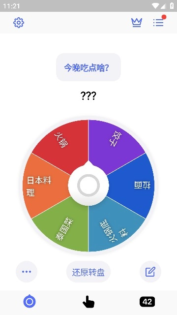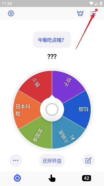 1、第一步先打开小决定应用,进入首页后,会看到一个较大的转盘界面,这个转盘默认设置的主题是“吃什么”,接下来找到转盘右上角的三条横线图标并点击打开。