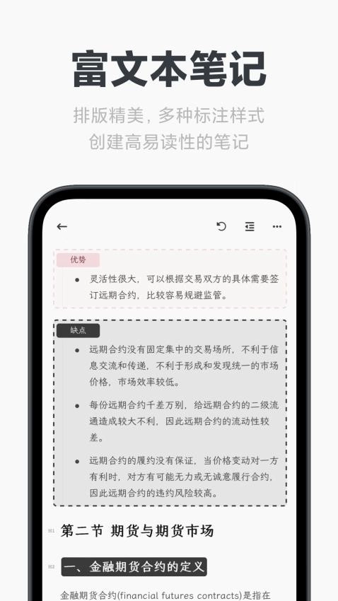 * 阅读体验:和备忘性质的笔记不一样,知识类笔记往往需要进行大量阅读与背诵。因此在阅读性方面,我们做了诸多优化,使知识内容更具层次感,比如可折叠的段落、外框总结、多种高亮样式、挖空设计等……