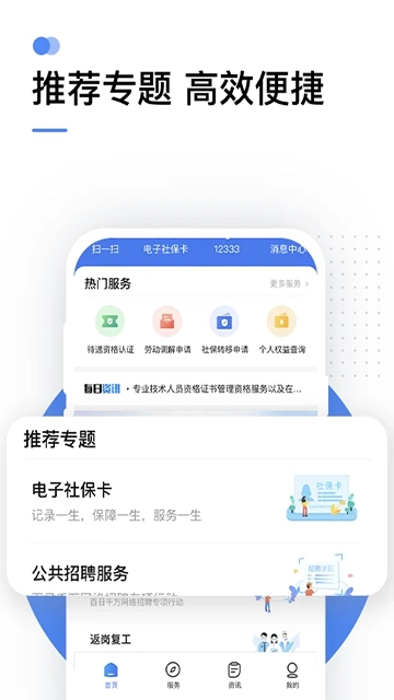 掌上12333是由全国人力资源和社会保障部打造的政务服务平台,集成了养老保险资格认证、社保卡服务、跨省异地就医查询、就业招聘等核心功能模块。职工办理跨省就医、查询个人社保缴费记录,或是查找最新招聘信息等需求,都能通过该平台一站式解决,大大减少了往返线下服务窗口的奔波时间。此外,平台还提供异地参保办理、社保待遇核算、政策公告推送等服务,助力用户更及时、全面地知晓相关政策。掌上12333App同时配备了权威政策解读、最新人社领域资讯、就业指导,以及养老、医疗等方面的专业信息,帮助用户实时了解行业动态,精准把握社保政策的最新走向。