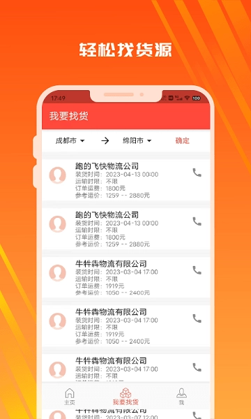 物流公司同样需要注册账号,发布货源信息,并且在车源市场里寻找合适的运力来运输货物。他们能够在主页的“我的订单”页面查看订单的状态以及详细信息。