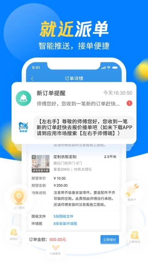 左右手师傅端是一款专为家具安装师傅打造的接单服务软件,旨在帮助师傅们便捷地完成随时接单、完工汇报、问题反馈以及结算提款等一系列功能操作。