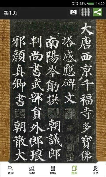 4、工具页设有“书法字典”功能,该功能支持对朝代、字体范围进行筛选,查询结果会以碑帖为基本单元呈现。点击相应碑帖单元即可进入单字页面,页面中会罗列此碑帖内的相关单字信息。