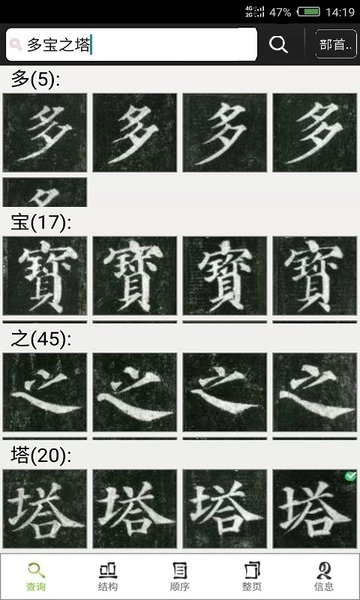 2、单字大图页会展示部首信息,借助这一信息可筛选出同一碑帖中相同部首的字列表;在已选定碑帖的单字大图页,点击顶部的标题文字,就能直接跳转至该字繁体形式的书法字典全范围查询结果页面;