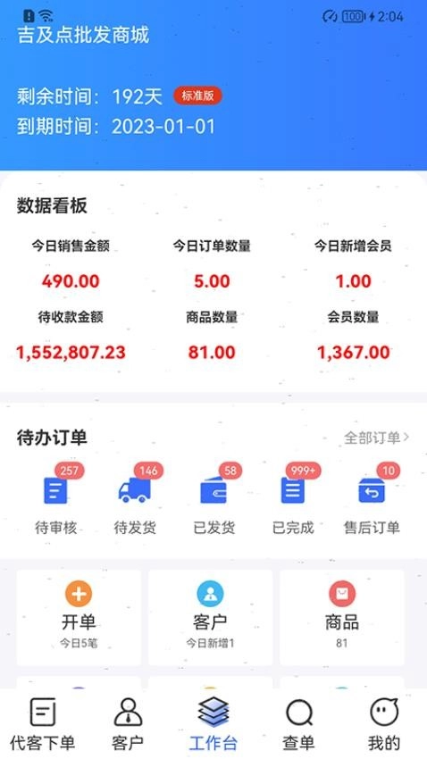 3、进入工作台板块,既能查看当日销售数据,也可了解待处理的订单。
