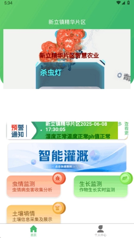环境监测:向用户展示今日温度、湿度、PM2.5等信息,助力其及时了解空气质量;还会提供土壤酸碱度(PH)、土壤温湿度以及空气温度等数据,方便用户对照判断各项指标是否处于正常范围,从而实时掌握土地环境的动态状况。
