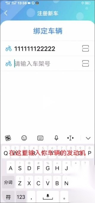 3、然后在这里输入要绑定车辆的发动机号和车架号;