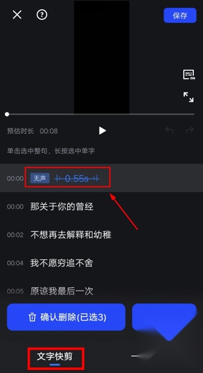 3、【文字快剪】具备智能识别视频内容的功能,能精准定位语气词、无声片段和重复片段;只需选中这些内容,就能一键删除,帮助用户快速提升剪辑效率!
