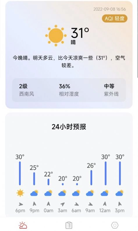 2、可向用户展示每小时的详细天气情况,若预报有降雨,还会明确显示降雨时段,方便用户提前准备雨具。