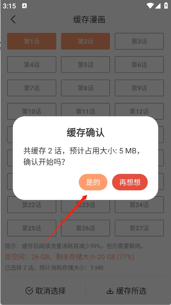 4、在出现的弹框中点击“是的”等待缓存完成即可。