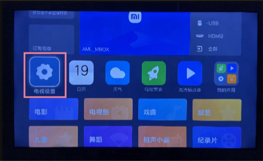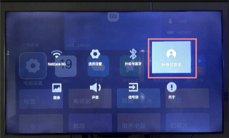 2、在小米或红米电视里,依次找到“设置”选项,然后进入“账号与安全”页面。