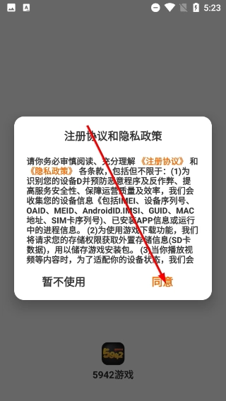 1、在5942游戏盒弹出的《注册协议和隐私政策》窗口中,仔细阅读相关条款后,点击【同意】按钮,即可完成协议确认并进入应用。