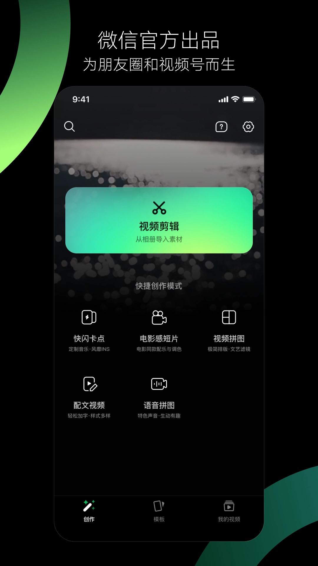 由微信推出的视频创作应用,支持一键把高清视频分享至微信平台。