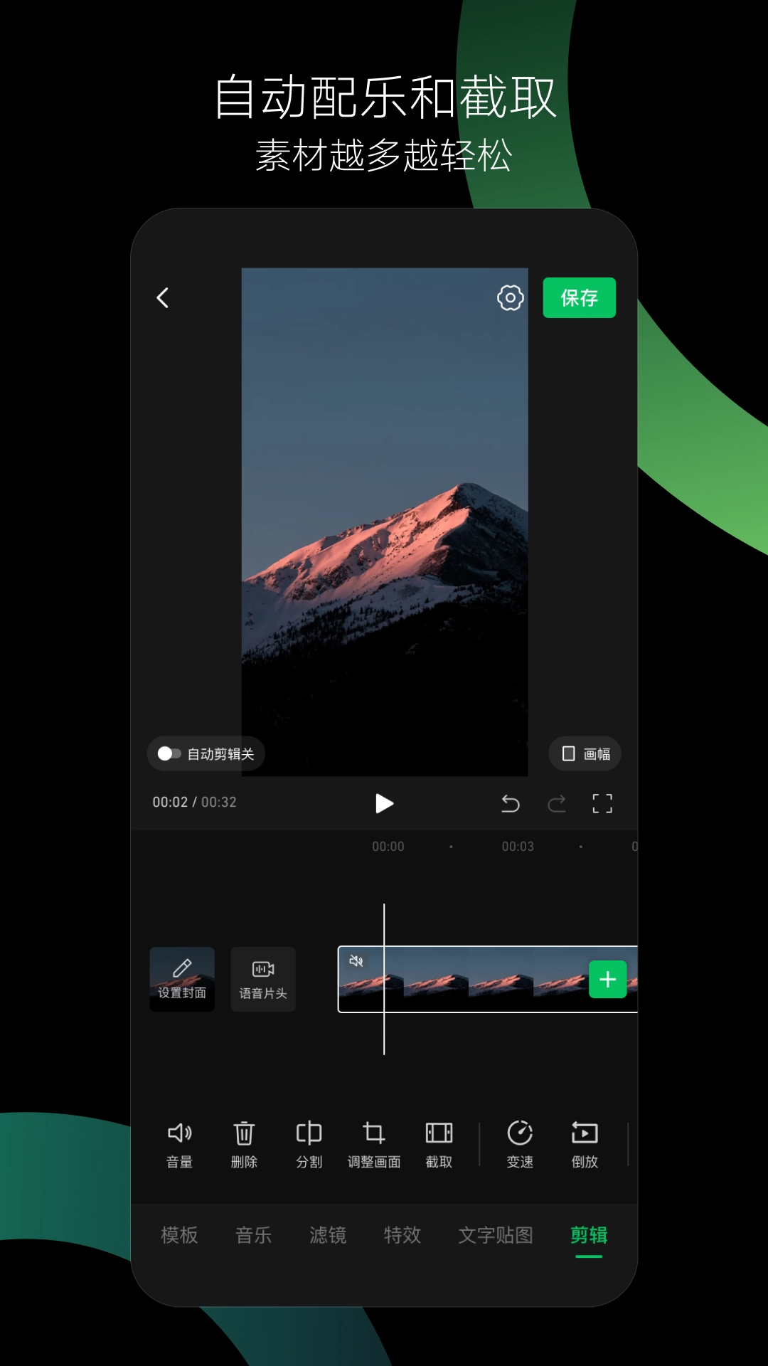 操作简便,功能丰富多样,涵盖滤镜、转场、特效、花字、贴图、字幕等元素,且由专业剪辑师自动完成配置。